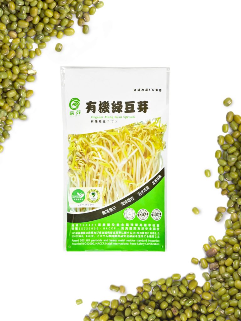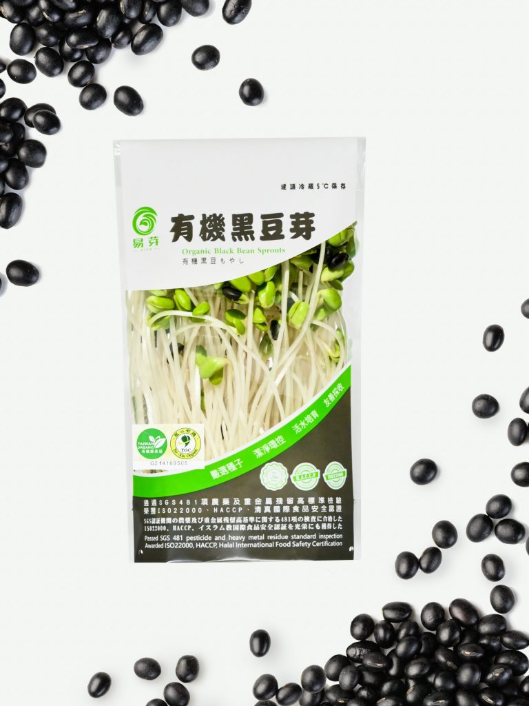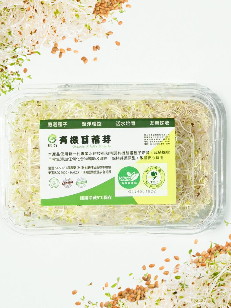 易芽農場使用對農作物友善的栽植方式,不推疊鋪豆播種,採收時保持全株完整,使用國家認證水質,活水循環,無蟲害,無重金屬,無添加化合物補助,保持芽菜原型,全株均可食用。